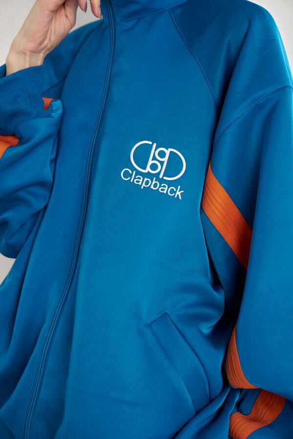 カラー Blue:鮮やかなブルーにオレンジのラインが映えるエネルギッシュなカラーリング。コーデのアクセントとしても活躍する一枚。