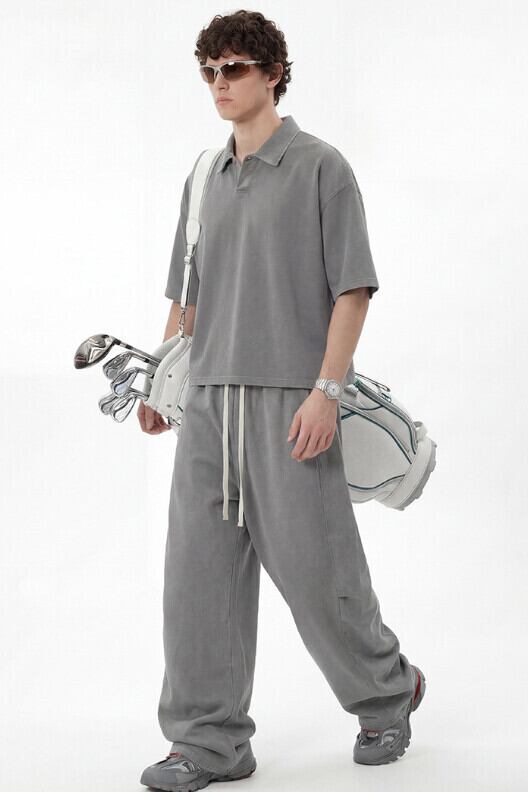 ゆったりとしたオーバーサイズのポロシャツと、ワイドなカーブパンツの 2 点セットで、ストリートスタイルやカジュアルコーデにぴったり。